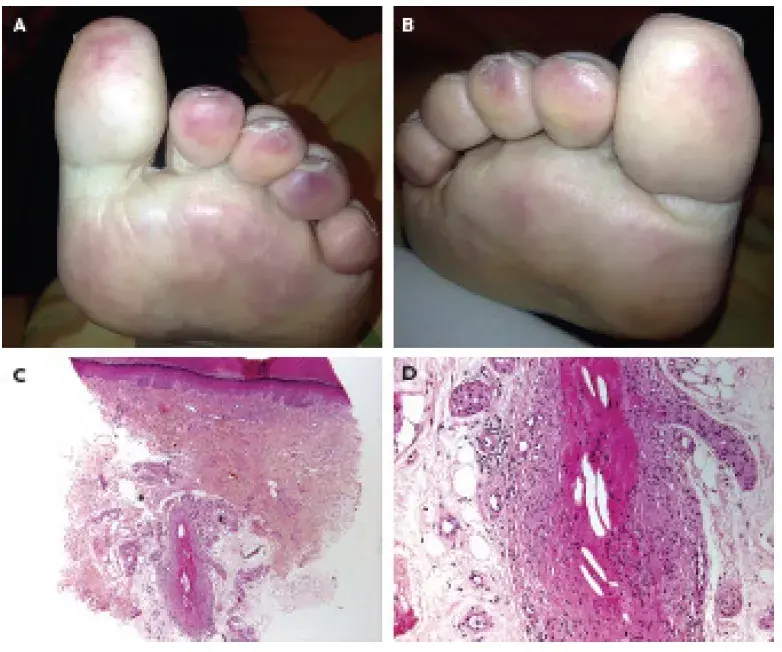 Biopsia de pele revelou cristais de colesterol obstruído arteríolas.