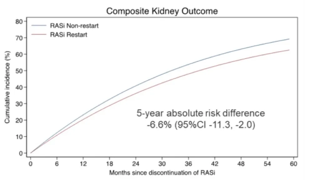 - O reinício de ISRA foi associado a uma redução de 15% no risco de desfechos renais adversos em comparação com a não retomada (HR 0,85; IC 95% 0,78 a 0,93).